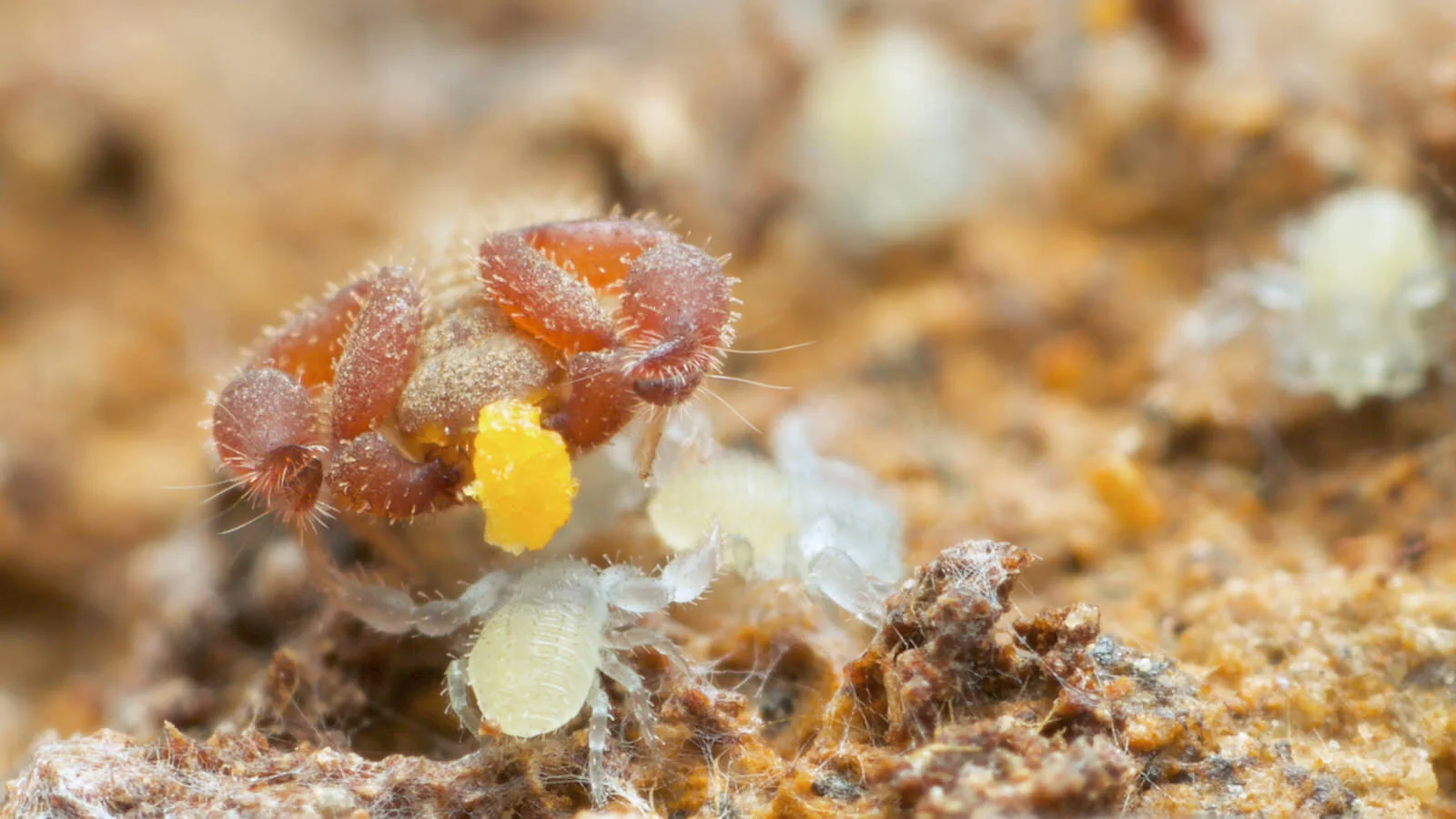 All female pseudoscorpions exhibit some form of parental care. They have a brood sac, in which they can carry their developing embryos, many travelling freely, while some species build special chambers from silk, where they can sit, protected until the pseudoscorpling nymphs hatch. But even then, this is not the end.